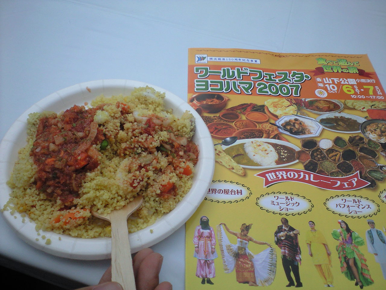 今回は世界の見知らぬ料理を食べようと思い、アフリカ料理やペルーの料理など、いっぱい食べました。 一枚目の写真はクスクスというアフリカ料理で、つぶつぶパスタが入ってます。 つぶつぶだから噛みごたえはないけれど、いつのまにかおなかが膨れてる感じ。